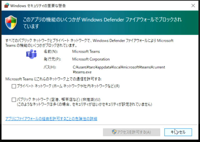 ホーム > M365 [Teams]チームを作る時にファイアウォールの警告が表示されます 基本操作 : ロイロノート Teamsでチームを作成する時にファイアウォールの警告が表示されます。 キャンセルを選択してください。 もし許可するとしても管理者権限が必要です。また、今後出ないようになる予定です。 M365, Teams 2021/07/20 PrevPrevious[ネットワーク]「インターネットなし、セキュリティ保護あり」と表示されます Next[ロイロノート]カメラのピントが合わず、ズームが固定されていますNext カテゴリー:M365 タグ:M365Teams 関連投稿 M365 / アプリ活用事例 / 授業支援 [M365]効果的な使用方法を教えてください M365 / タイルアイコン / デスクトップアイコン [M365]Teamsアプリの更新方法 M365 / アプリ基本操作 [M365]家庭からMicrosoftのアカウントにログインできません M365 / アプリ基本操作 / 授業支援 / 教員向け研修 [M365]教員:OneDriveを自宅でも学校でも使用できますか? M365 / 授業支援 [M365]職員室で作った動きのあるPowerPointを教室で投影させることは出来ますか? M365 / 障害一次対応 [M365]PowerPointに動画を埋め込むと音がでなくなります 前の投稿 [ネットワーク]「インターネットなし、セキュリティ保護あり」と表示されます 次の投稿 [ロイロノート]カメラのピントが合わず、ズームが固定されています