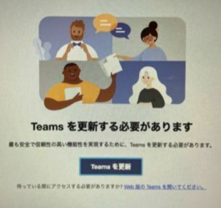 ホーム > M365 / タイルアイコン / デスクトップアイコン [M365]Teamsアプリの更新方法 基本操作 : M365 Teamsをクリックしたら下記画面が出て先に進めません。 下記手順に従って作業を行って下さい。 ①「Teamsを更新」をクリックしてMicrosoft Teams をダウンロードするページへ。②「デスクトップ版をダウンロード」をクリックして実行する。 ※もし何台もまとめて更新を行う必要があるなら、GIGAフォルダにダウンロードしたexeファイルを移動させて各端末で実行すると効率よく更新できます。 M365, Teams 2021/07/20 PrevPrevious[初期設定]先生から初期設定以外のご依頼があった場合 Next[日報]移動時間の入力についてNext カテゴリー:M365タイルアイコンデスクトップアイコン タグ:M365Teams 関連投稿 M365 / アプリ基本操作 [M365]家庭からMicrosoftのアカウントにログインできません M365 / 授業支援 [M365]職員室で作った動きのあるPowerPointを教室で投影させることは出来ますか? M365 / 障害一次対応 [M365]PowerPointに動画を埋め込むと音がでなくなります M365 / アプリ基本操作 / 授業支援 / 教員向け研修 [M365]教員:OneDriveを自宅でも学校でも使用できますか? M365 / アプリ活用事例 / 授業支援 [M365]効果的な使用方法を教えてください M365 [Teams]チームを作る時にファイアウォールの警告が表示されます 前の投稿 [初期設定]先生から初期設定以外のご依頼があった場合 次の投稿 [日報]移動時間の入力について